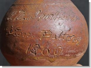 small jug, of the form produced in Devon at Honiton from the 17th to the late 19th century. This inscribed J.M.Jenkins , Honiton pottery 1869.