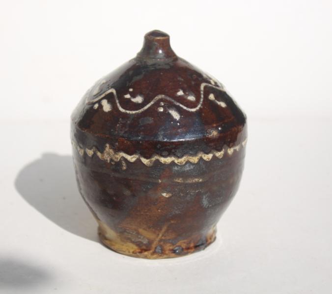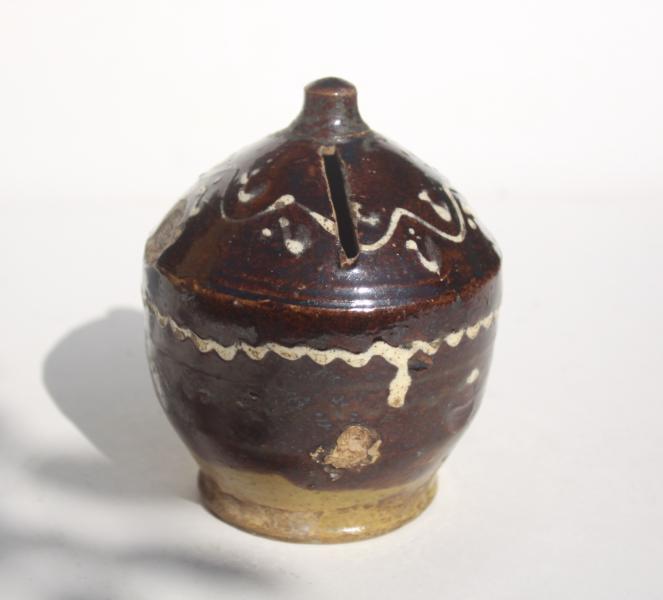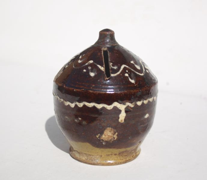 A wonderful slip decorated money box of traditional form. Dark brown glaze.