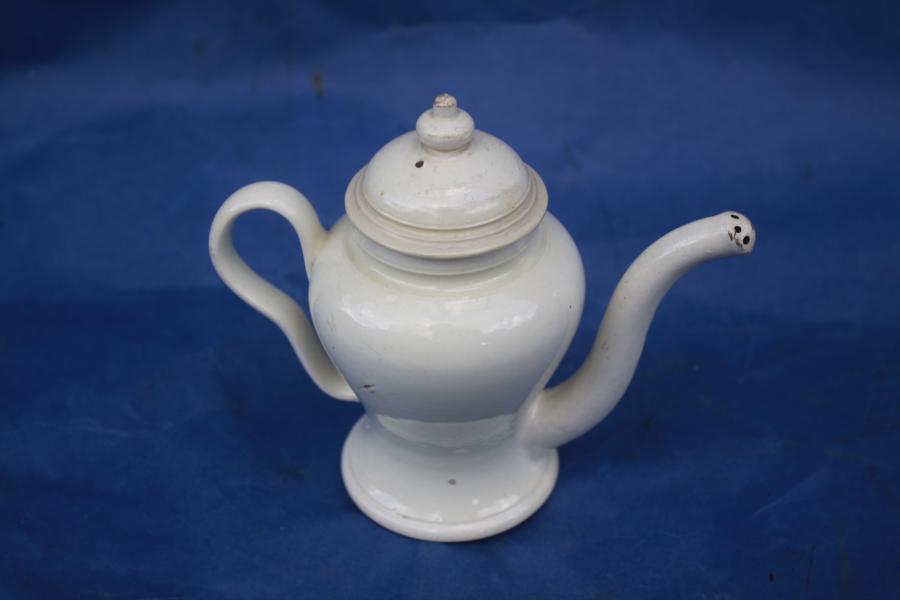 A rare late 18th century creamware child's feeder. Of inverted baluster form. The slender curved spout with pierced end and ear shaped handle.