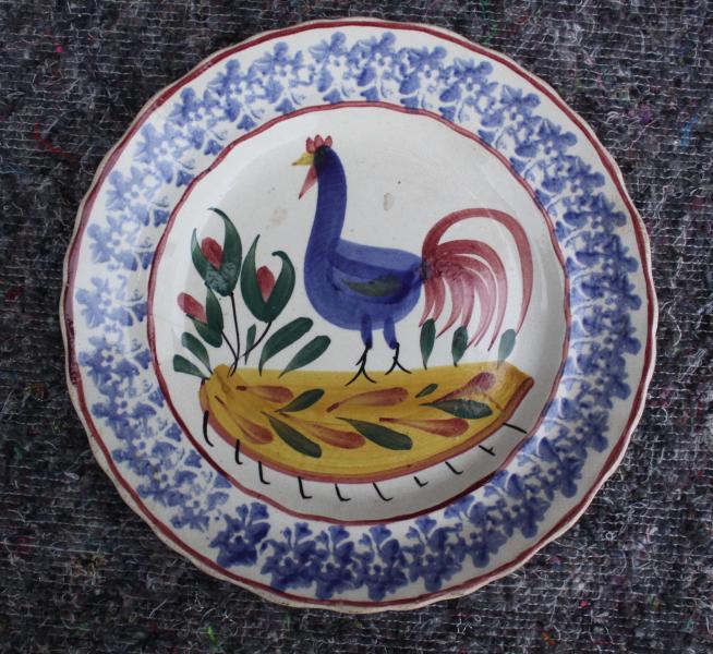 Red lines enclose blue sponge flowers that form the border of this plate, The central image of a blue cockrel is pure folk art. Additional overglaze enamels of green red ect add to the image. Traditionaly associated with the decorator Sarah Roberts. Llanelli Pottery, Wales, circa 1900.