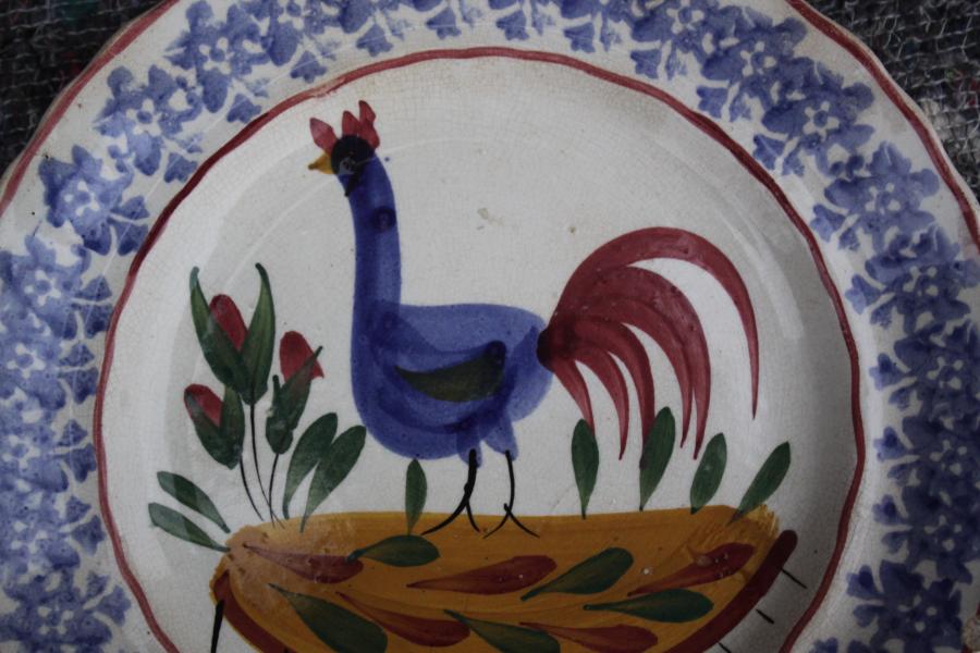 Red lines enclose blue sponge flowers that form the border of this plate, The central image of a blue cockrel is pure folk art. Additional overglaze enamels of green red ect add to the image. Traditionaly associated with the decorator Sarah Roberts. Llanelli Pottery, Wales, circa 1900.