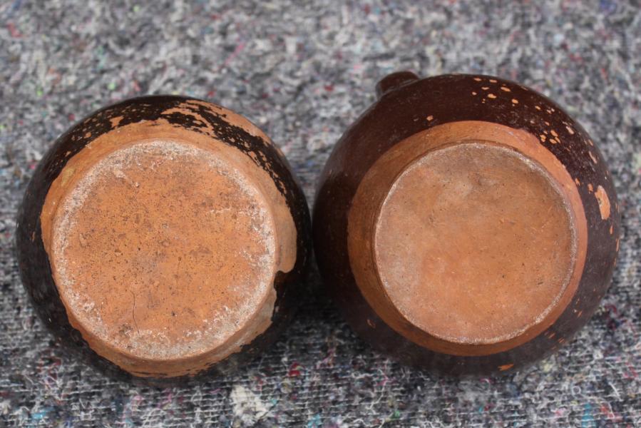 Two harvest flasks that were acquired together some time ago by a collector and brought by us yesterday one the one on the left probably early 19th the other late 19th century and displaying a slight change in form . Both from the same area, Possibly Wiltshire Wiltshire. |