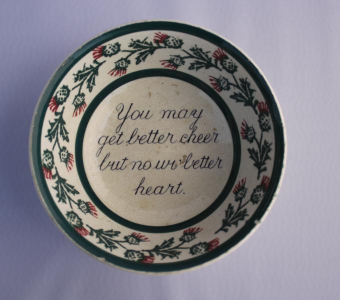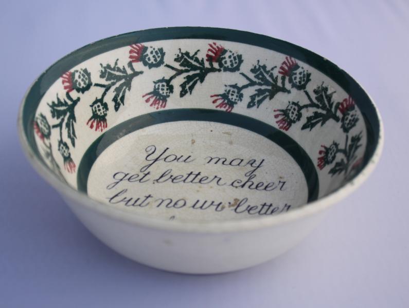 Scottish Motto spongeware bowl. Transfer printed verse with deep sponge border.
