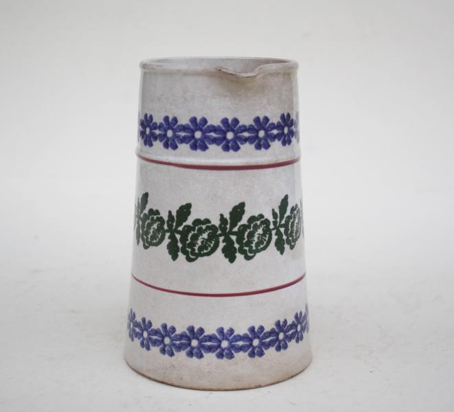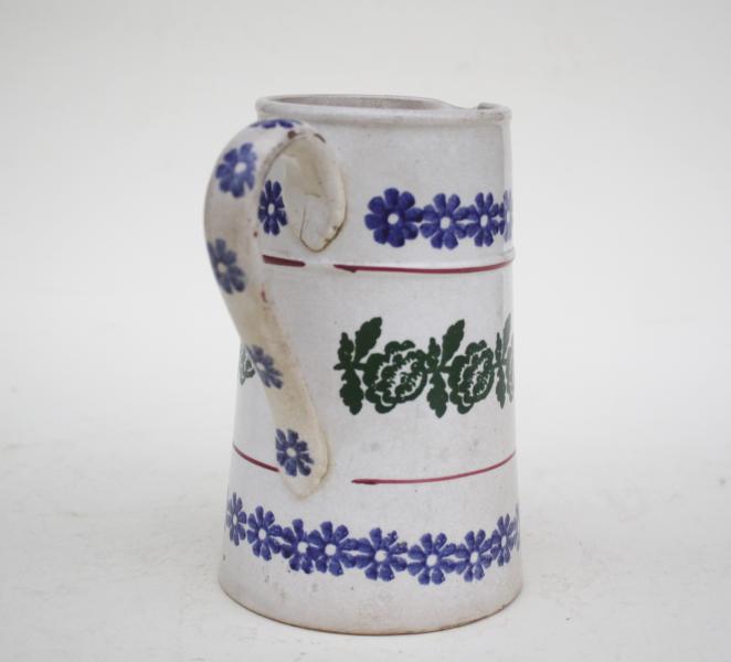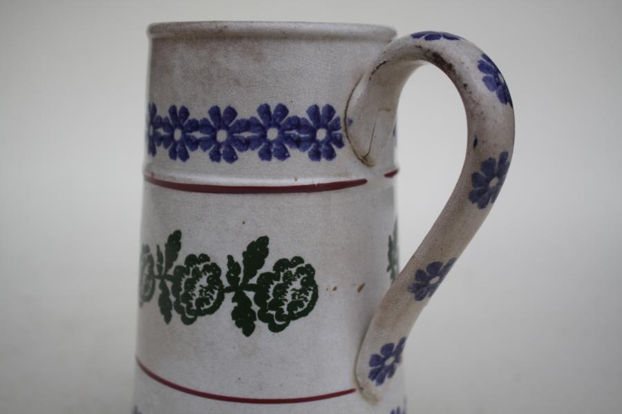 Sponge ware jugs are uncommon, this delightful jug has two bands of blue flower heads, with more down the handle, also with a central band of green flowers with leaves.