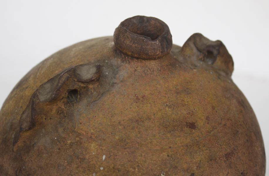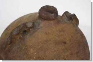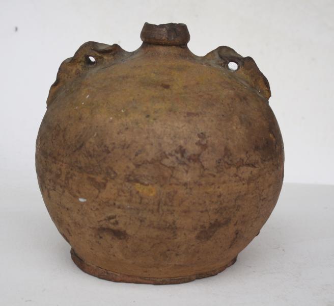 An early probably mid 19th century Verwood Owl Costrel. Of traditional form with pinched lug hanging handles.