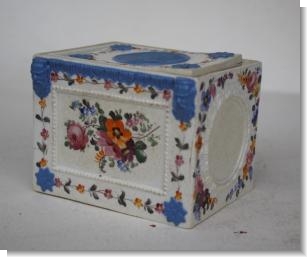 An interesting "Castleford" white stoneware box with a portrait medallion of Christopher Columbus, enamel flower decoration and gilt edge. circa 1820.