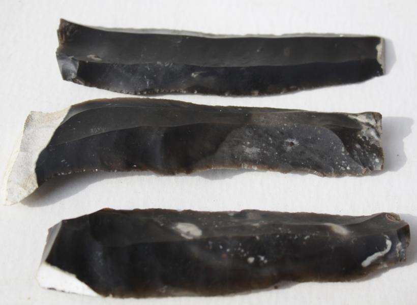 Neolithic flint tool knifes. Knapped dark brown / black flint.