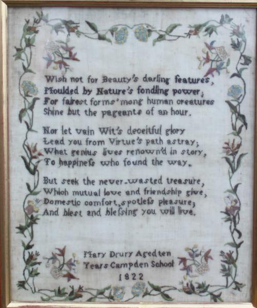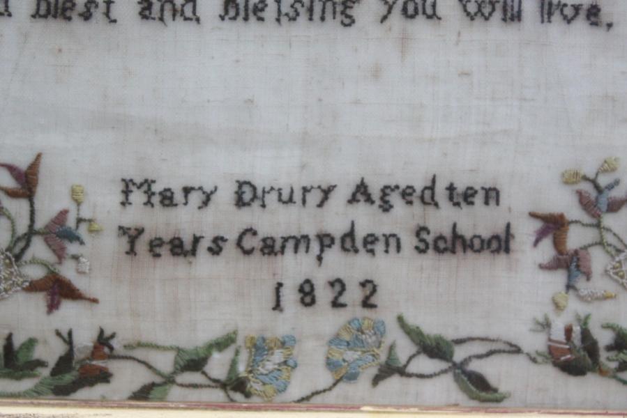 A GEORGE IV NEEDLEWORK CHIPPING CAMPDEN SCHOOL SAMPLER BY MARY DRURY, worked with coloured silks on a fine gauze ground, with a virtuous text within a freehand meandering flower border, signed and dated 'Mary Drury aged ten years Campden School 1822', in a later glazed bird's eye maple frame. 32 x 37 cm