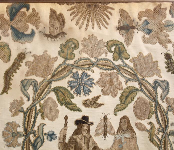 worked with various stitches and techniques and appliqued onto a satin weave cream silk, depicting Charles II and Catherine of Braganza holding hands under a flower entwined arbour, with a caterpillar, a butterfly and a bird, with further flowers and insects, above a rocky lake flanked by a recumbent stag, unicorn, lion and leopard.