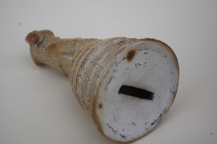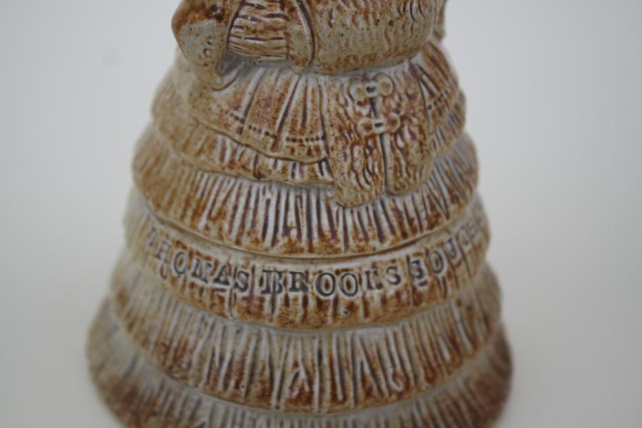 A very unusual mid 19th century saltglaze money box in the form of a woman holding a ruff. Inscribed around her skirt THOMAS BROOKS SOUTHHORSBY.