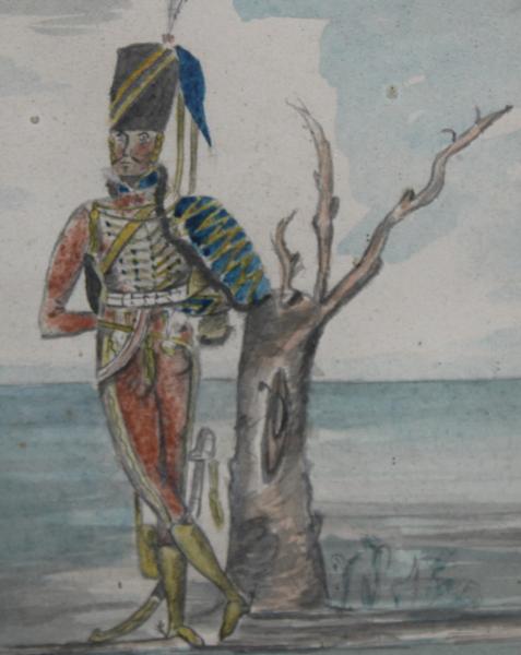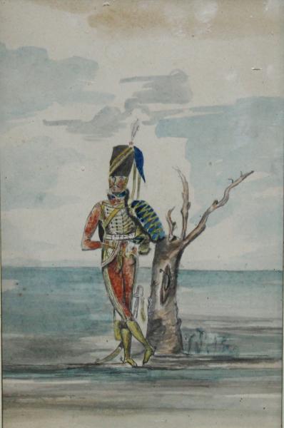 What an tantalising watercolour of a hussar Cavalryman leaning on a tree stump. That stump the “Waterloo Elm” the very tree his commanding officer Wellington stood under during the great battle of Waterloo. To think he was there and survived, I think still more people died in that square mile than at any over battle ?. And he like todays selfie’s wanted to record it, I just wish I could read his name on the back.