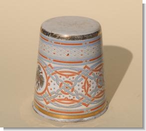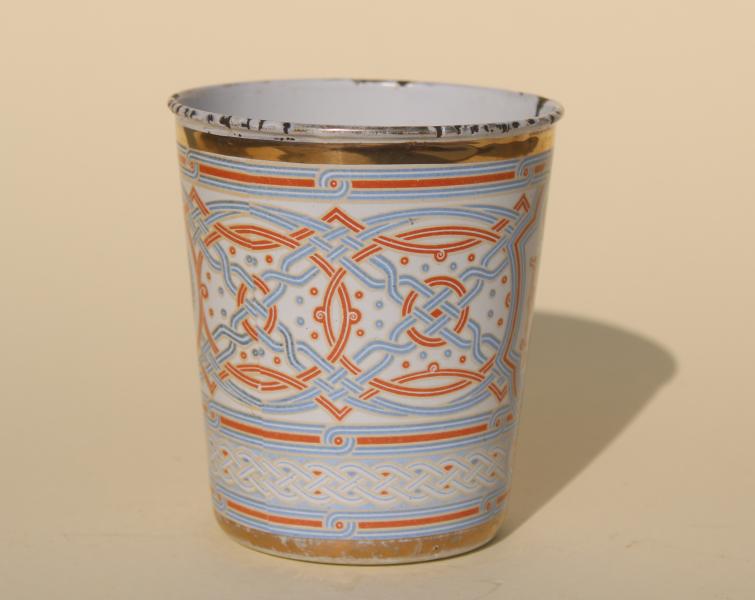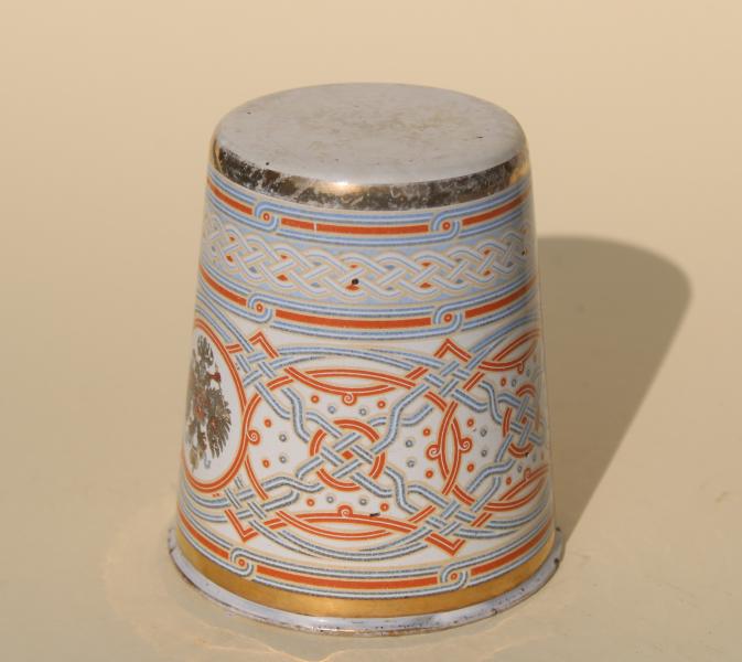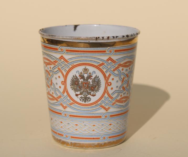 The Khodynka Cup of Sorrows aka Coronation Cup , Sorrow Cup or the Blood Cup . 3000 were made for the coronation ceremony of Tsar Nicholas II and Alexandra Feodorovna in 1896. The cup has both their cyphers on the front surrounded by a geometric pattern and two gold rings as with the Romanov eagle on the opposite side. These beakers were distributed to celebrate the coronation of the Russian monarch Nicholas II.