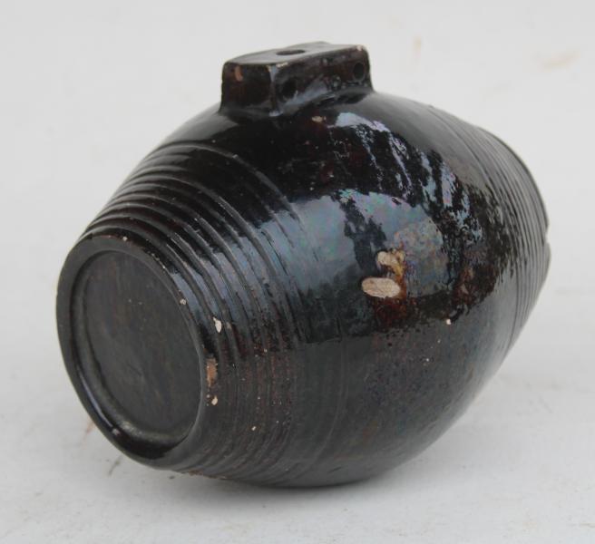 Wonderful deep brown almost Black glaze of this costrel barrel makes it stand out .