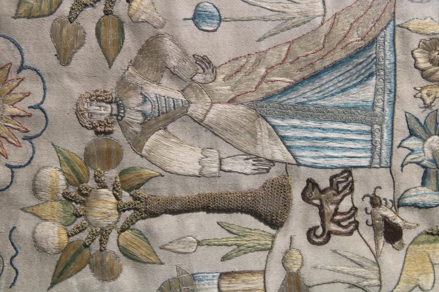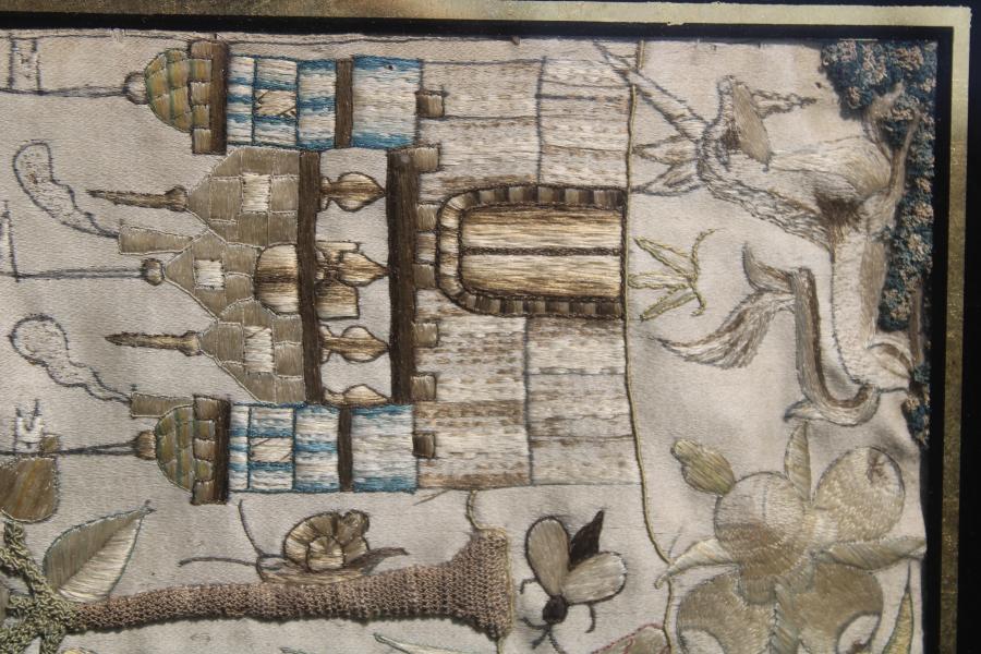 A good mid 17th century silk needlework depicting a central female figure walking out with her dog, from her large castle like palace on the left. She is depicted surrounded by flora and mystical beasts including a unicorn and wyvern and more common animals such as a Lion and squirrel.