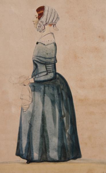 A classic early 19th century portrait of a young woman, standing holding a letter and hankie chief over her arm.