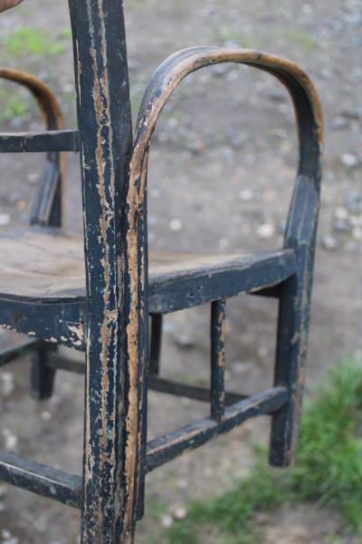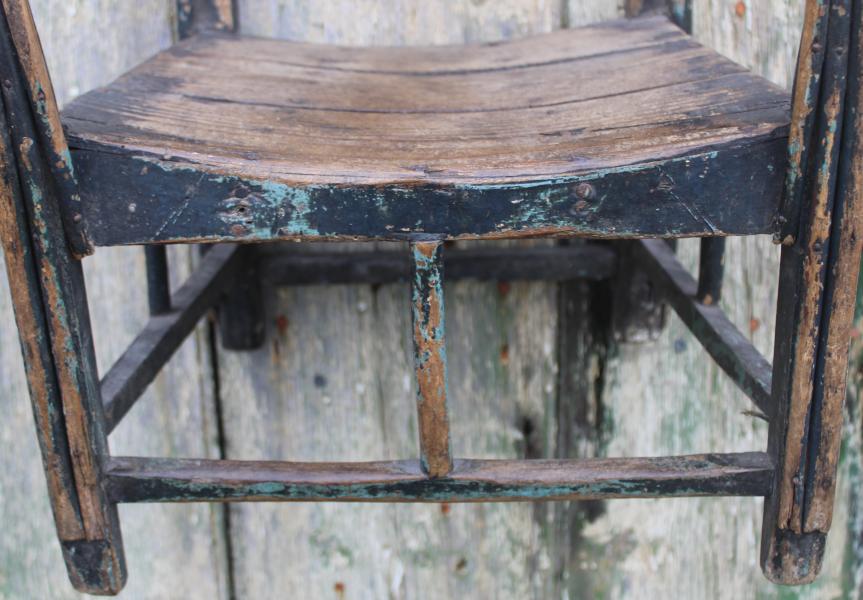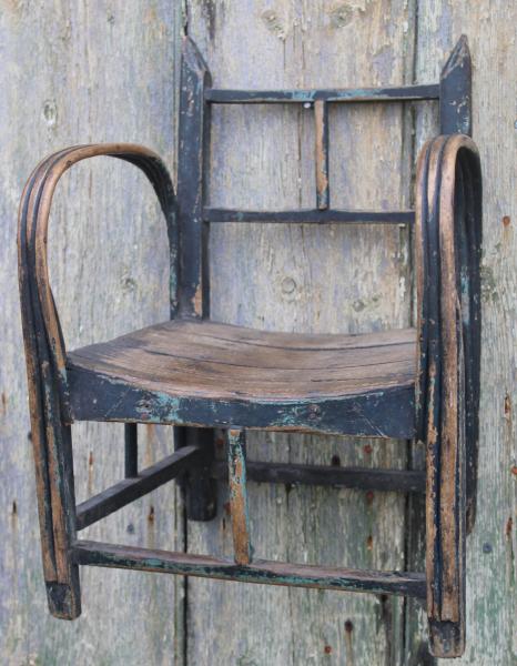 A wonderful sculptural child's chair of wonderful form and great colour, showing unusual amount of ware to the seat surface and arms and feet rest, giving a deep colour to the wood through the original painted surface.