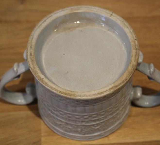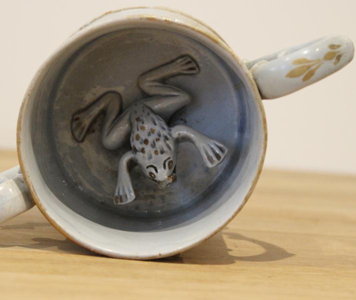 A very rare and unusual form, Usually in an earthenware pearlware body often attributed to Fell although other makers made them I have not come across a solid blue body nor a loving cup containing a blue frog.