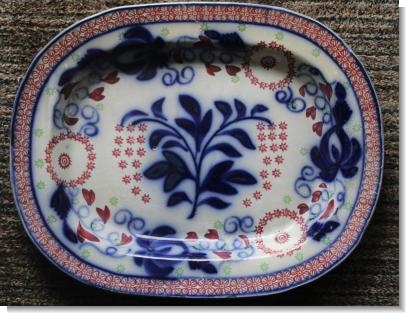 STRIKING FLOW BLUE & SPONGE DECORATED PLATTER.