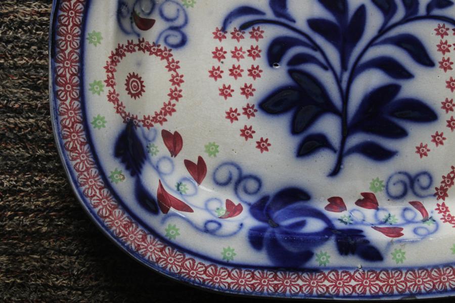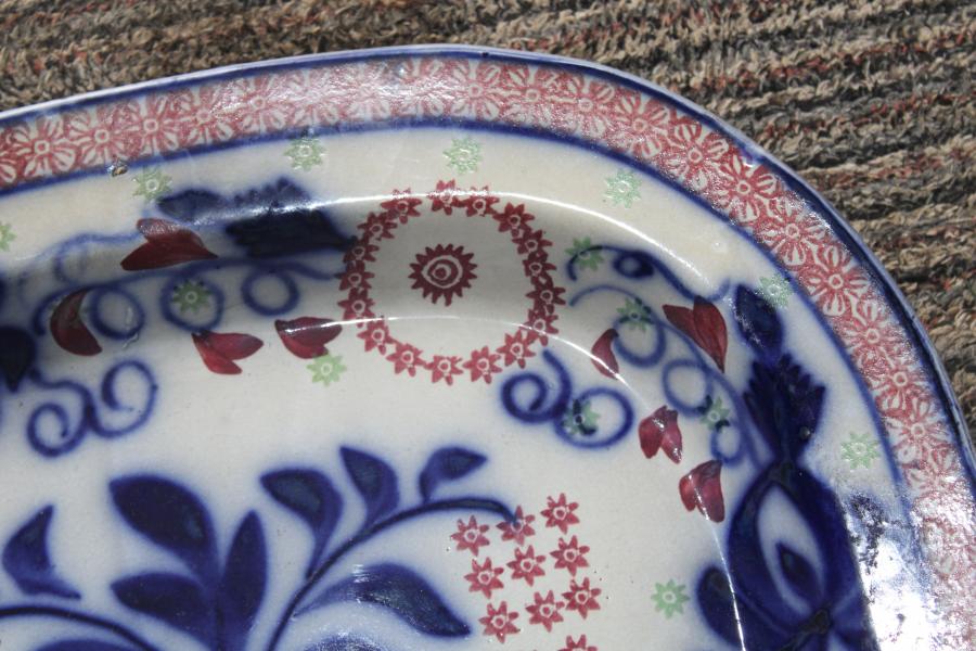 A striking late 19th century flow blue and sponge decorated platter.