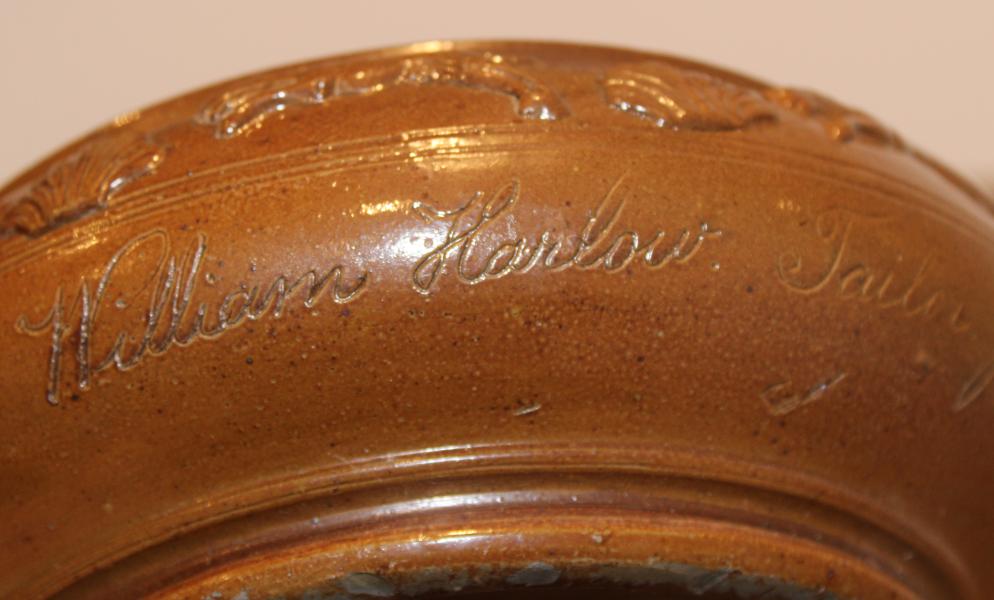 A rare and very interesting Saltglaze dog bowl. The rim with applied running dogs and acanthus leaves, is inscribed below William Hobson, Taylor January 23 1860. Probably when he acquired his dog. William is listed as a Taylor of Town end, in a number of directories including 1857 Whites History and 1881 Kelly's directory.