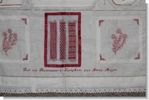 An interesting and unusual late 19th century School sampler by Anna Meyer , "Made at the Boarding School Gyseghem" .