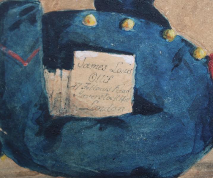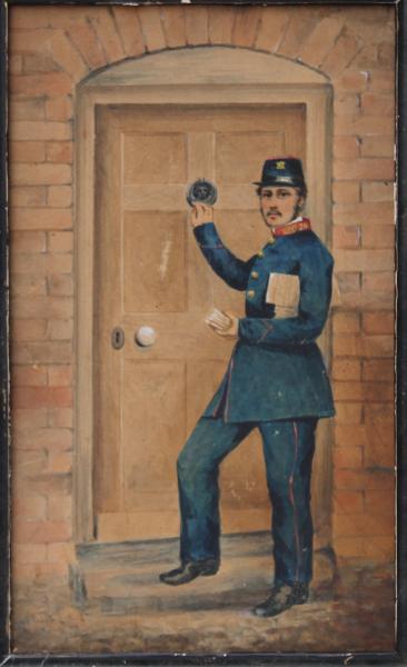 A very rare late 19th century water colour depicting a postman "GPO 20" on his collar VR on his cap. Seen standing at a door delivering a latter to James louis Ollif, of 47 Fellows road Haverstock Hill London.