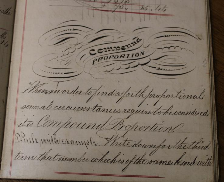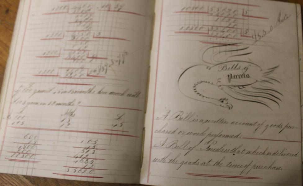 A wonderful school math's book signed to the front Thomas Haigh's 1871 with fine calligraphy swan titles, and pages of written work. many giving an insight to 19th century life...