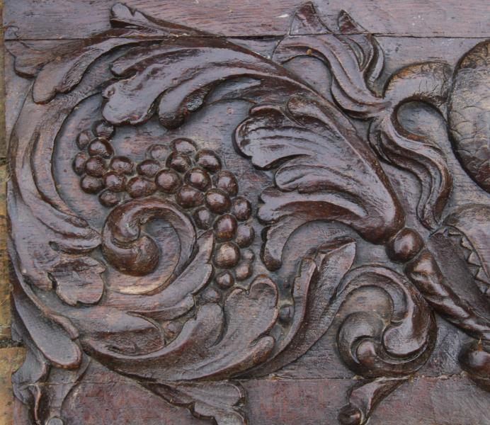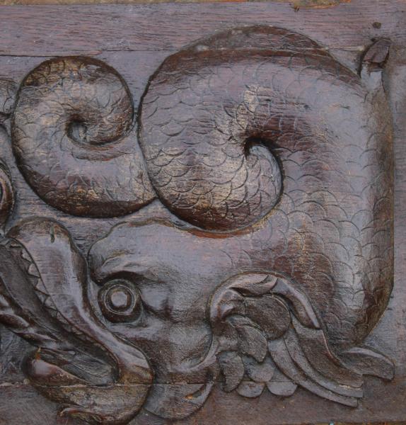 An unusually large mid 17th century panel depicting a Winged Dolphin or Whale with foliate & fruiting bodies spouting from its mouth.