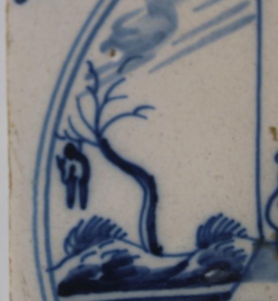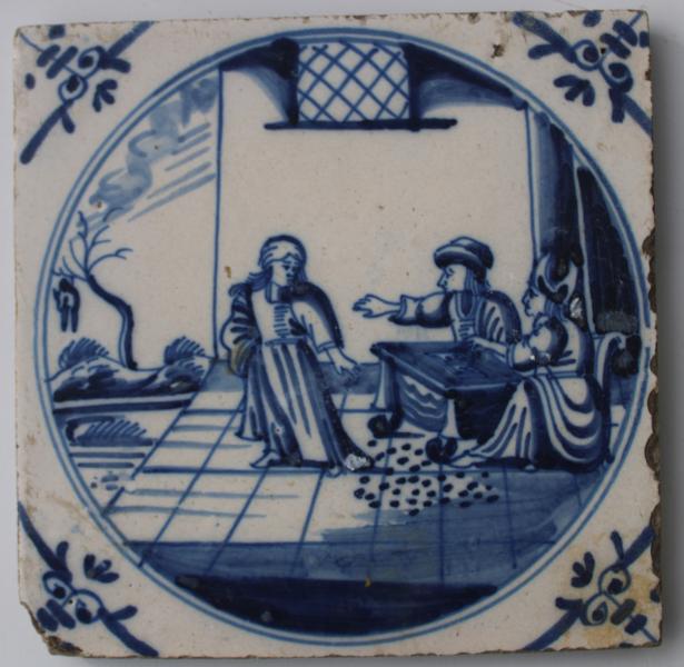 An interesting mid 18th century Delft tile telling the story of Jesus and the 30 pieces of silver , with Judas as the bible refers to traders being expelled and this scene concentrates more on Temple officials and an individual.I do not understand is the image of the hanged man in the background. |