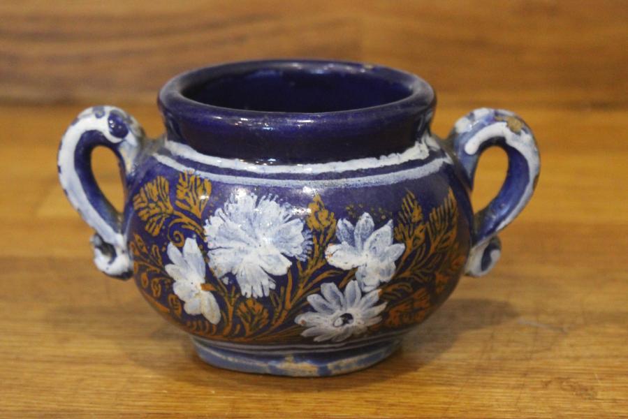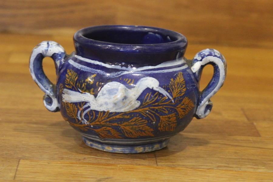 Towards the end of the 17th Century the French potters at Nevers, (central France) developed a blue glaze "Gros Bleu" or "bleu persan" in response to Persian potters and decorated it "blanc fixe" this proved popular and the English & Dutch followed with "bleu de Nevers" with the decoration either Oriental in style or with white splashes. The manor of decoration proved somewhat short lived confined to the period of c.1680-1700. But forms an important stepping stone in European Ceramic history.