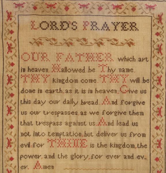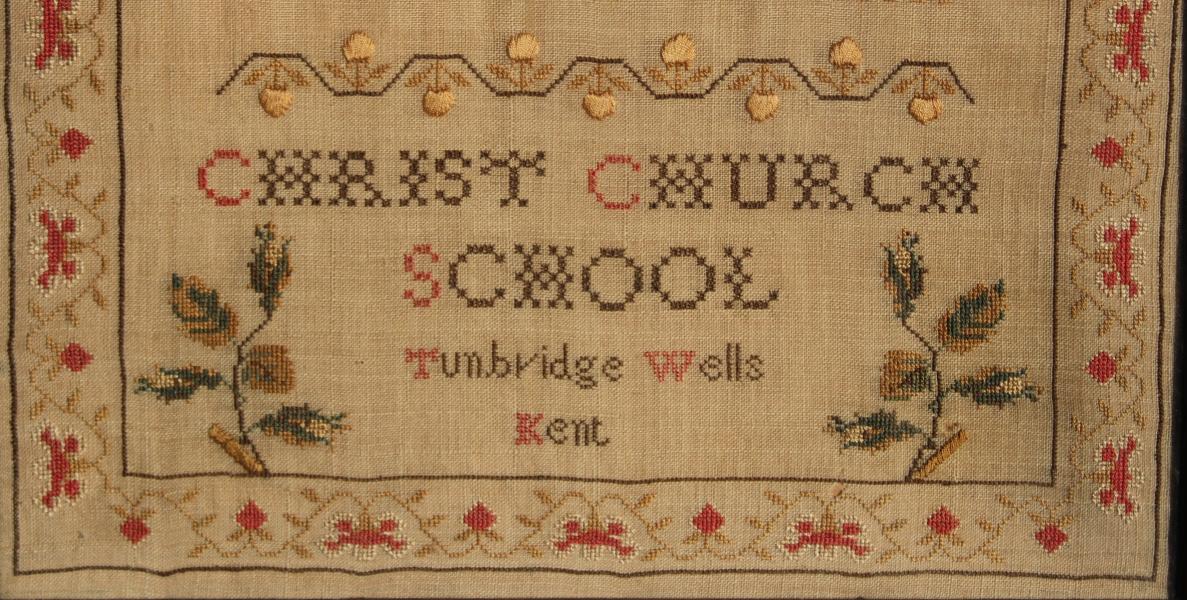 This unusual sampler was possibly done by a teacher or a group of children in the early years of the school as a teaching aid and "poster" demonstrating the standard of work achievable in the New School. |