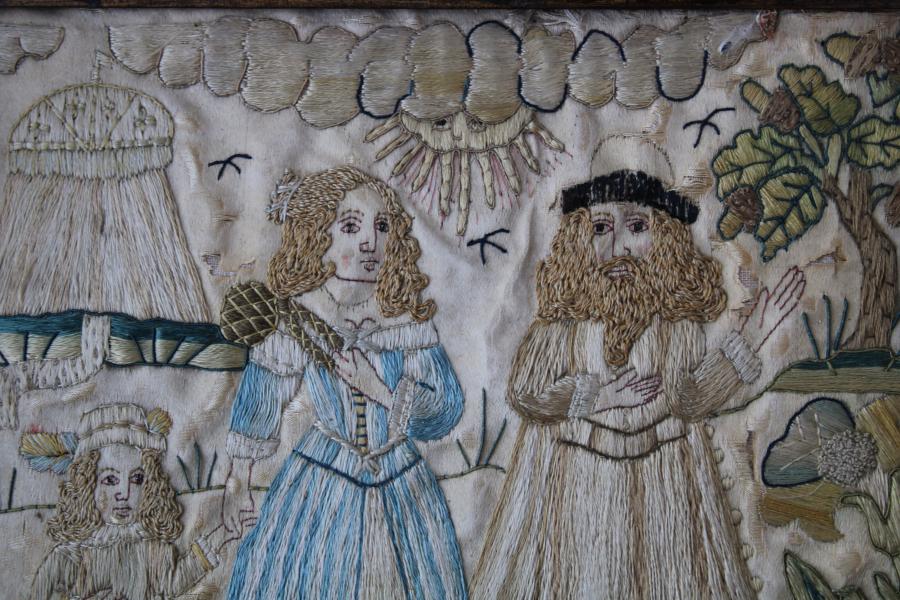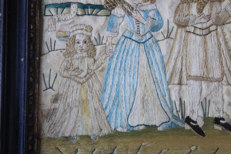A charming 17th century silk needlework depicting a family.