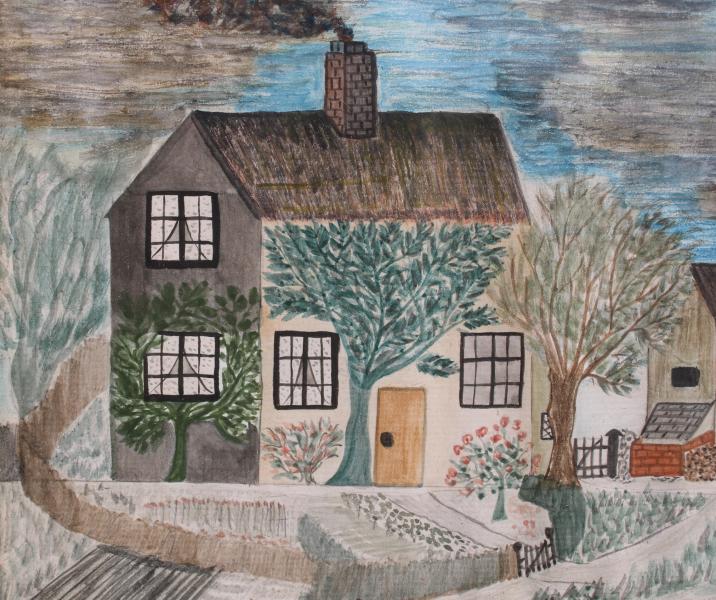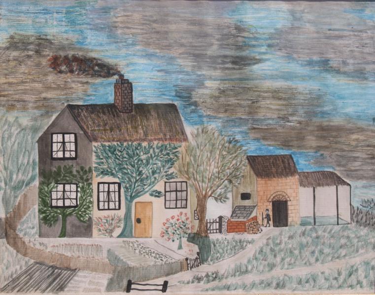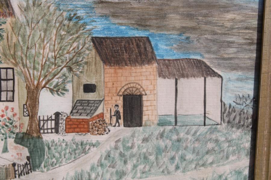 Wonderful naïve water colour of a farmhouse with out buildings including a small pole barn.