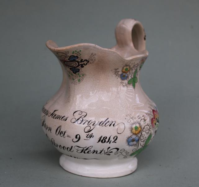 A charming mid 19th century earthen ware jug commemorating the birth of Thomas James Broyden in 1842. The second son of Rachel & James a Taylor of Rochester.
