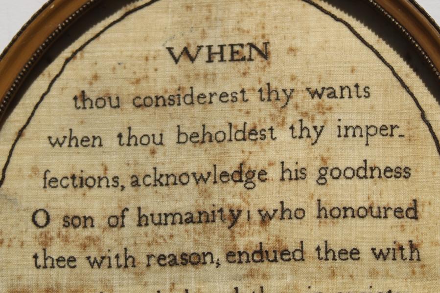 An oval extract sampler worked in monochrome by Phoebe Wright with text ''when thou considerest thy wants when thou beholdest thy imperfections, acknowledge his goodness O son of humanity, who honoured thee with reason, endured thee with speech , and placed thee in society , to receive and confer reciprocal helps and mutial obligations.''
