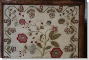 One of an interesting group of samplers worked in this way, that can also include central panels in Quilts. We have as yet not tracked down the area they were made but possibly Lancastershire or at least Northern they all shred a wonderful freedom of expression in there style.