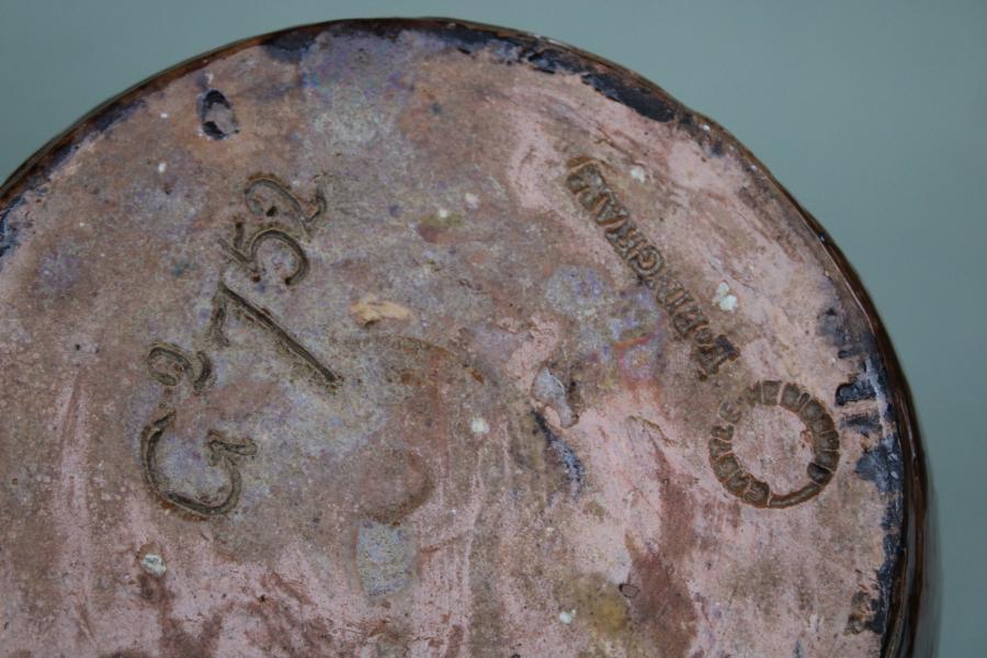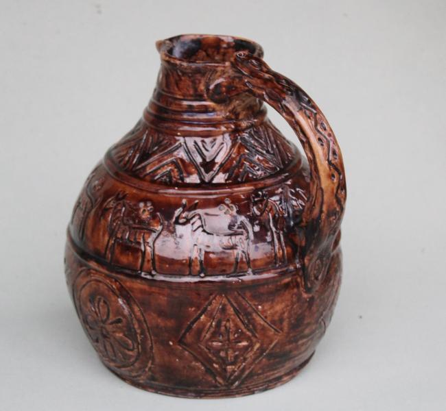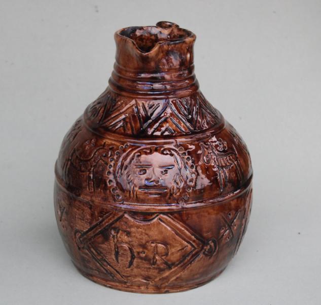 This early jug follows the the classic form of Medieval jugs but has wonderful incised decoration of animals , a face to the front and initials HR. Is made from the local clay and glazes made famous by the post medieval potters from Gestingthorp . Impressed marks of E.Binghan, Castle Hedingham and incised G2 752. |