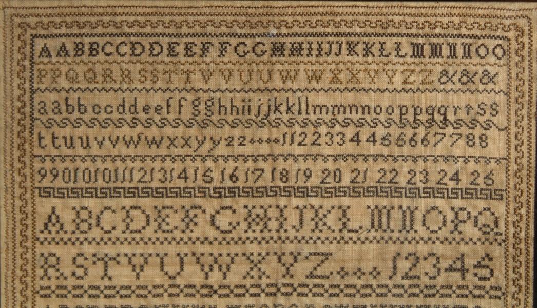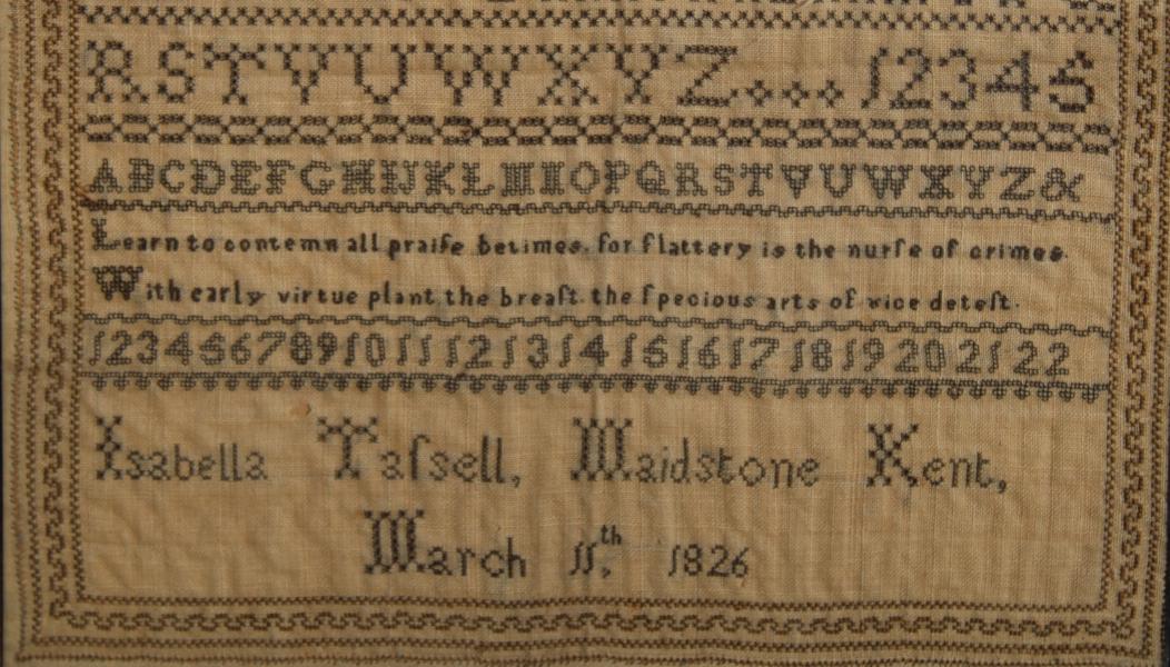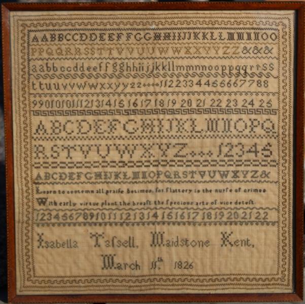 A classic school sampler worked in a traditional style with bands of alphabets and numbers with a different border pattern between. Signed across the bottom ISABELLA TASSELL, MAIDSTONE KENT March 11.1826.