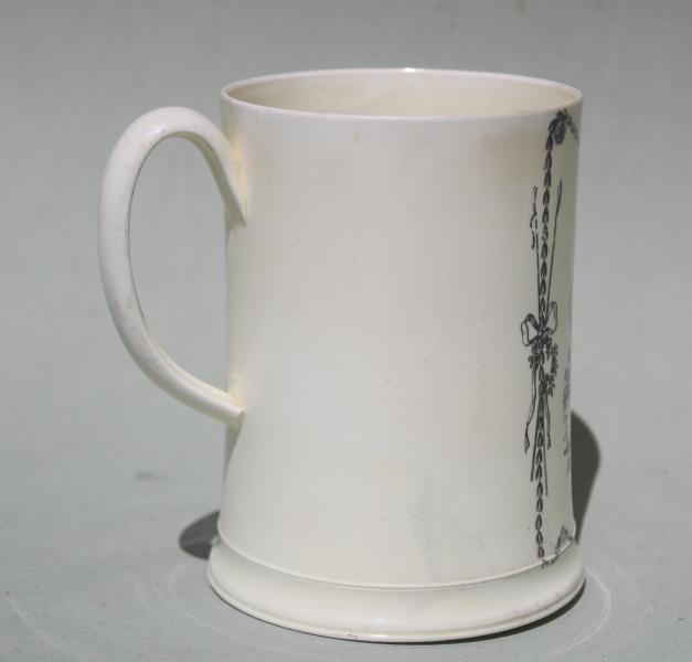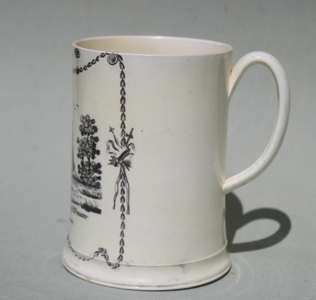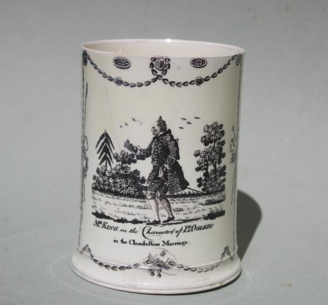 A rare creamware tankard with molded foot printed in black with a scene entitled ‘Mr King in the character of Ld Ogleby in the Clandestine Marriage’.