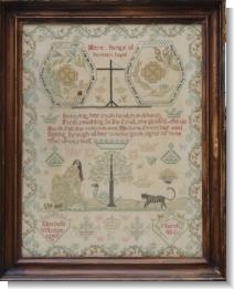 At the top a pair of hexagonal panels with short statements of virtues, have not only flowers stitched but the pencil drawings our Elizabeth had made before stitching her sampler.