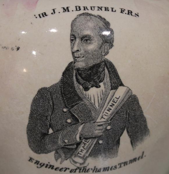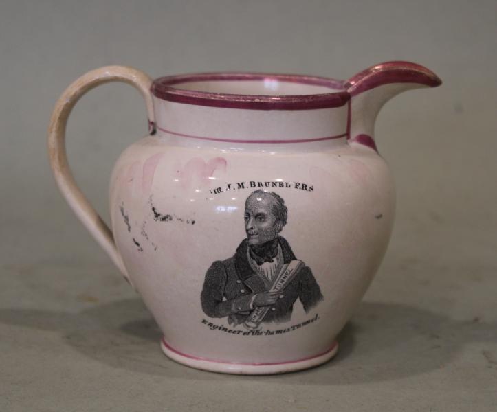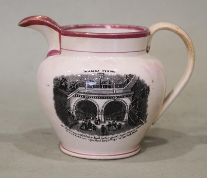 A pearlware Thames Tunnel Brunel commemorative jug with pink luster, circa 1843, printed in black with a titled view of the tunnel above inscribed facts, to the reverse a titled half length portrait 'Sir J.M. Brunel F.R.S., Engineer of the Thames Tunnel'.