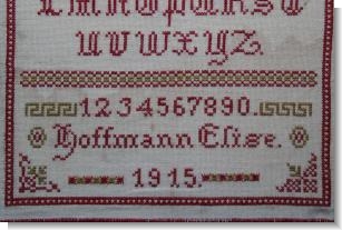 A striking early 20th century German sampler worked in the traditional style of alphabet followed by numbers with the sewers details Elise Hoffmann and date 1915 following .