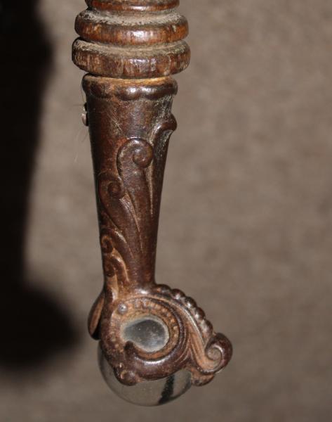 Turned oak legs with cast iron feet with glass balls. The upholstered seat, the underside with cast makers mark on the adjustment screw .