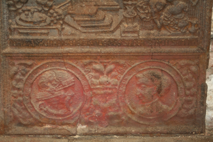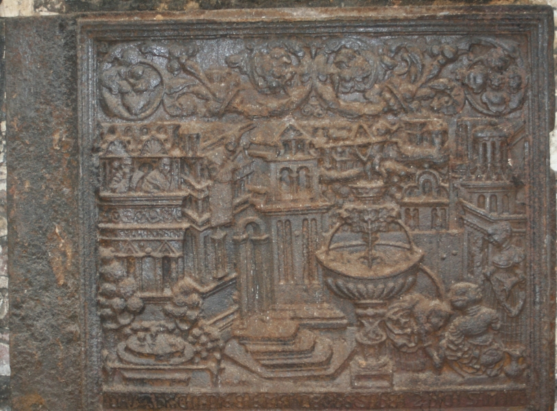 see V&A (319-1897) Stove panel from the same workshop with different subject and lacking lower Romaine heads. ill M.Campbell 'Ironwork' fig 59. |