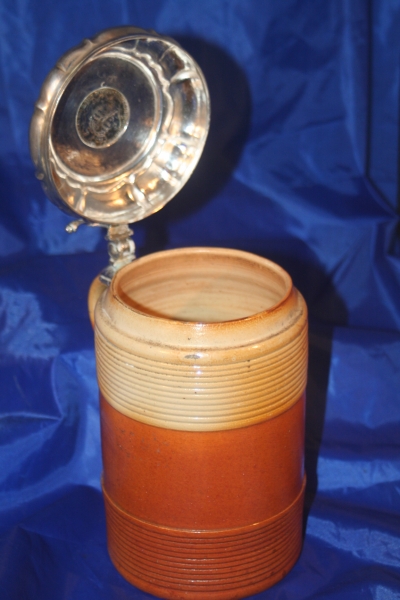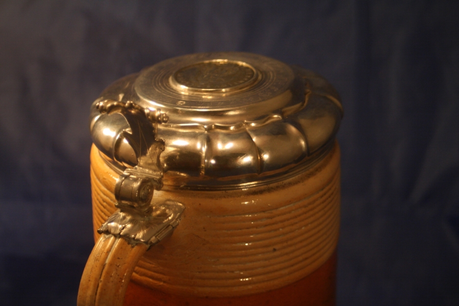 Rare mid 18th Century Silver mounted saltglaze tankard. The Bown and baeige tankard with turned decoration is typical of the first half of the 18th Century. The Moulded silver lid is set with a gilt coin surrounded by pricked initials and the date 1749. Scroll acanthus thumbpiece.