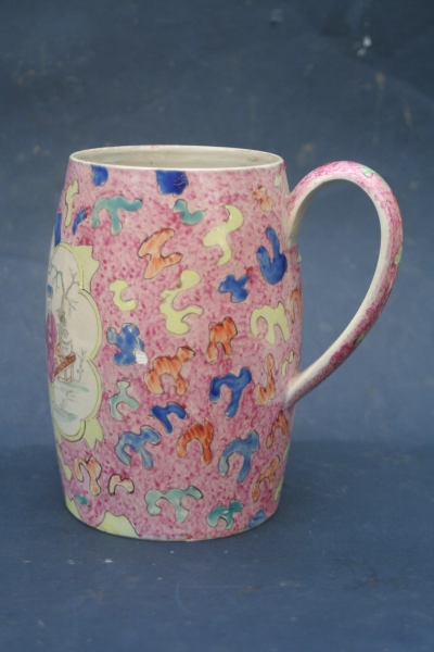 A very rare and unusual 18th Century pearlware tankard decorated in over glaze enamels very much in a saltglaze style. This same style of decoration with a shaped panel is recorded in Creamware & Pearlware Re-examined by Tom Walfod page 110 on a teapot dated 1784 he attributes to the North East England. I also remember a coffee pot again dated in the mid 1780s sold at Sotheby's with the same style of decoration.