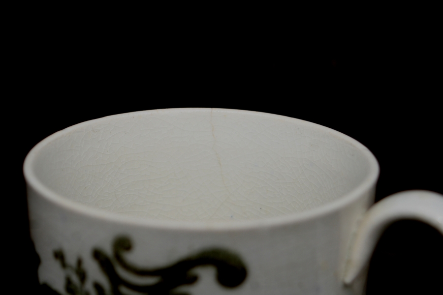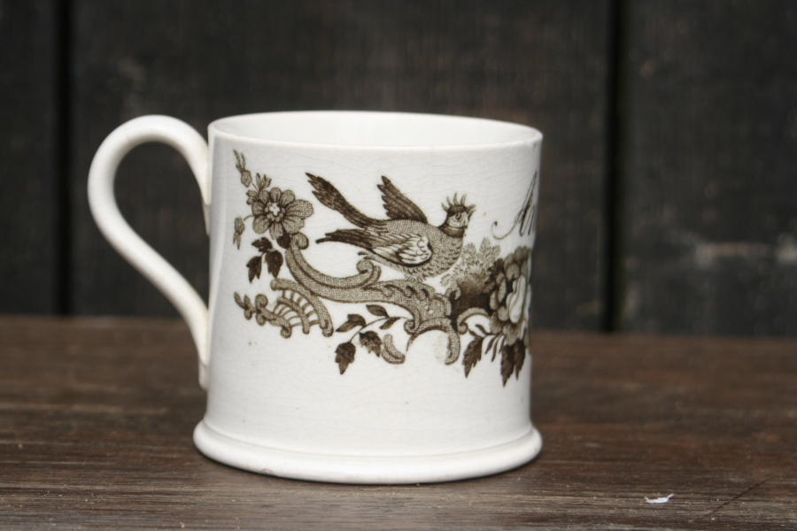 An early childs mug, transfer printed with a floral pattern including a birds that frame the central name ANN.