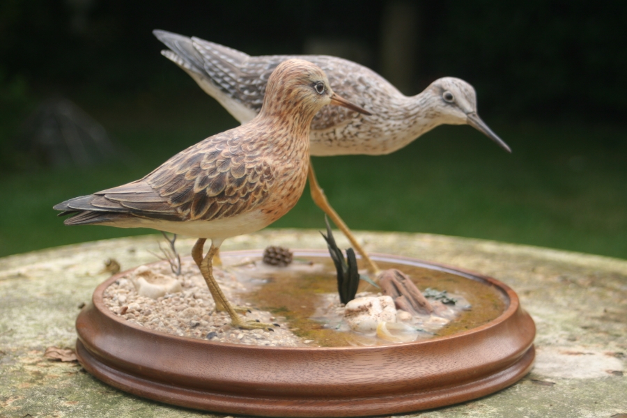 . don't know when a carved decoy becomes fine art or when fine art becomes a decoy. These exquisitely carved shore birds are placed in a naturalistic environment including shells and seaweed with clear resin forming the water. I think they represent a Dunlin and Snipe ,