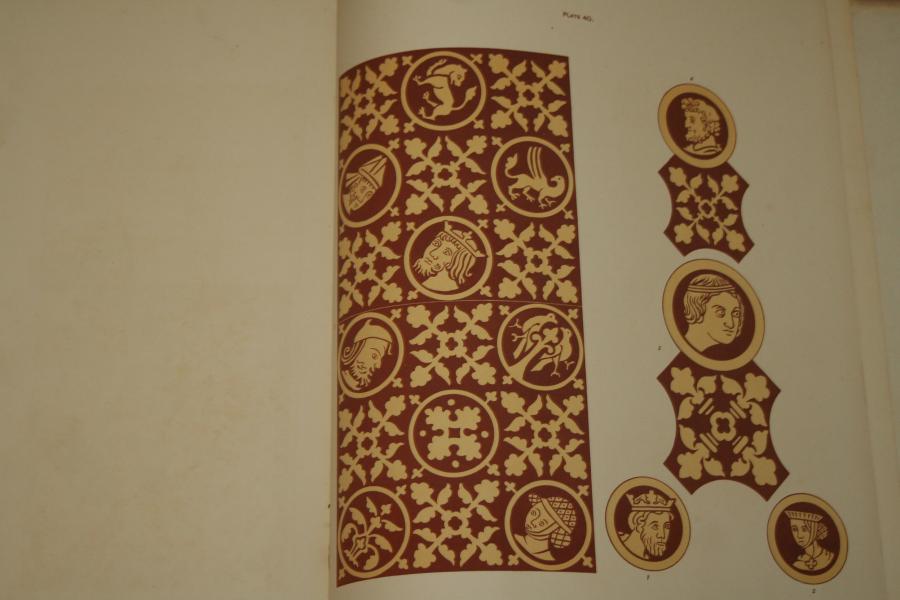 A very rare large format book. TILES FROM CHERTSEY; Tiles from Chertsey Abbey Surry, formed the pavement . From drawings by Mr Manwaring Shurlock. 41 coloured plates of medallions representing the chief incidents relating to the Romance Poems "Richard Coeur de Lion" and Sir Tristrem are drawn full size.