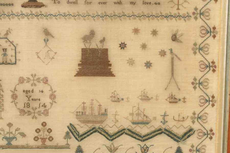 .An exceptional sampler by Elizabeth Smith dated 1814, depicting just about everything, including her farmhouse with a large naturalistic horse, ships and boats under a bridge.